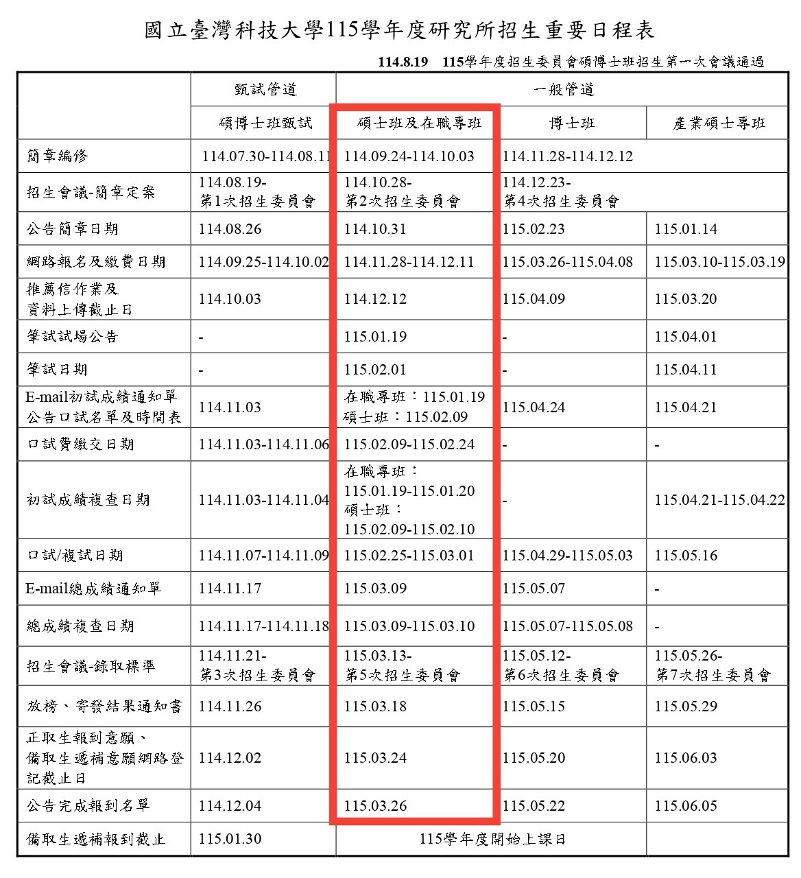 一、115學年度研究所招生重要日程表公告(EMBA詳見下方在職專班日程) EMBA在職專班免筆試!