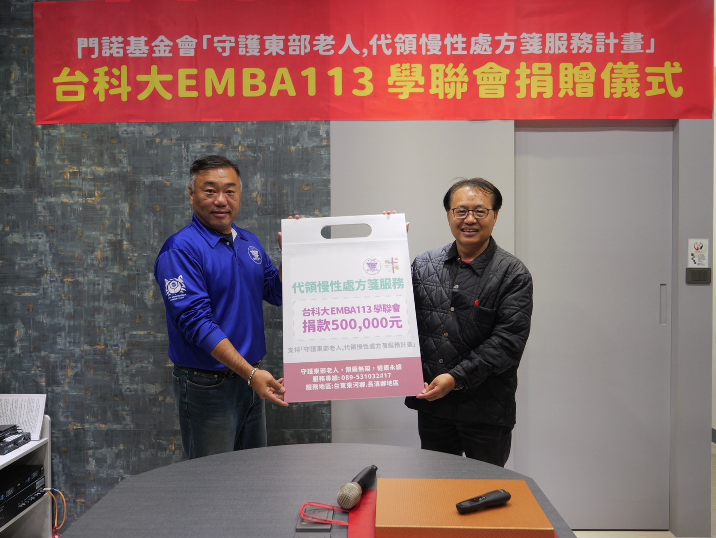 於歲末之際,臺科大管理學院 EMBA 學聯會前往門諾基金會臺東區域中心,捐贈 新臺幣 50 萬元,支持偏鄉長者之慢性處方送藥服務,實際投入東河鄉、長濱鄉等地的在地照護行動。